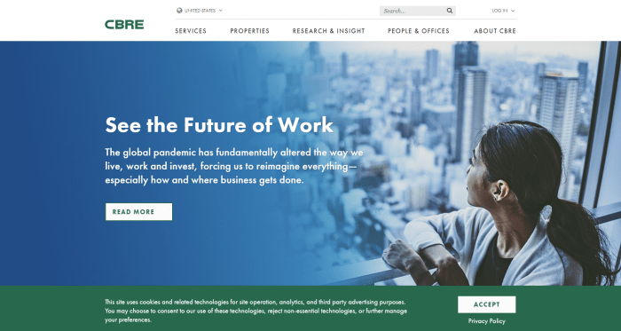 CB Richard Ellis has more than 100,000 professionals around the globe who provide exceptional outcomes for clients in over 100 countries. CBRE team members combine local market insight, broad services, specialized expertise, and premier tools and resources. They have worked to provide companies with the right office space for over 100 years. In 2021, as the global pandemic has forced everyone to fundamentally changed the way they live, work, and invest, CBRE has been forced to reimagine everything, including the way business gets done.